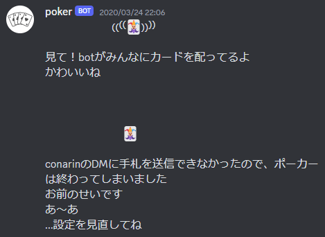 DMに送信できなかった場合(Botをブロックしている、DMの受け取りを拒否しているなど)、ゲームは強制終了します。