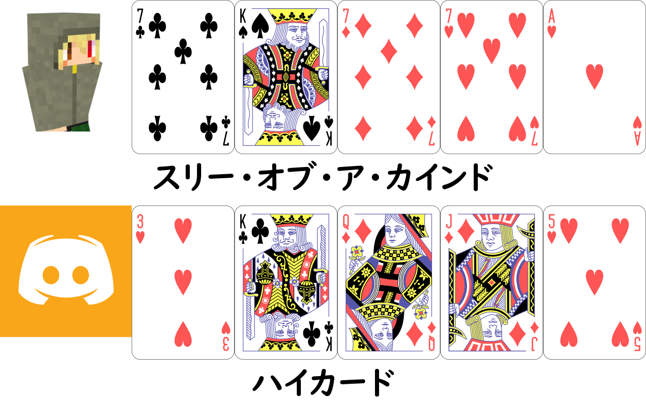 全員のアクションが終わり次第、Botが役の判定を行い、結果を表示します。